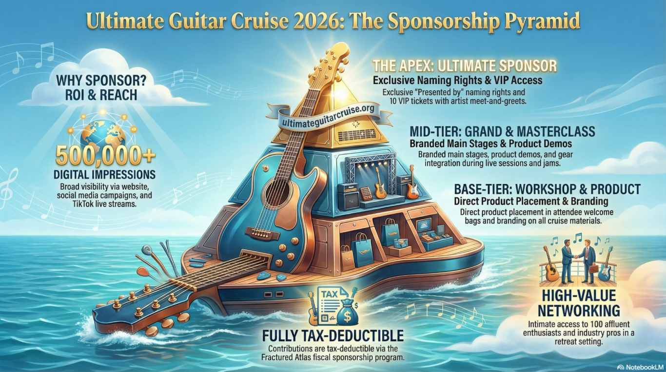 The Ultimate Guitar Cruise is a sponsored project of Fractured Atlas, a non-profit 501 (c)(3) arts service organization. Contributions for the charitable purposes of The Ultimate Guitar Cruise must be made payable to “Fractured Atlas” only and are tax-deductible to the extent permitted by law.